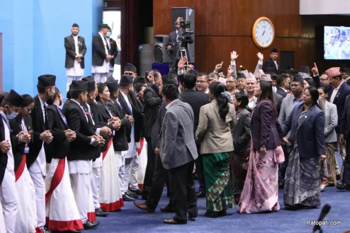 काठमाडौँ । नेकपा एमालेका सांसदहरुले वेल घेराउ गरेका छन । वेल घेराउसँगै प्रतिनिधिसभा बैठक २० मिनेटका लागि स्थगित गरिएको छ । प्रतिनिधिसभाको शुक्रबारको बैठकमा उठेर विरोध गरिरहेका उनीहरुले सरकारविरुद्ध नाराबाजी गर्दै वेल घेराउ गरेका थिए । सत्तारुढ माओवादी केन्द्रका सांसद लेखनाथ दाहालले पशुपतिनाथमा पित्तलको